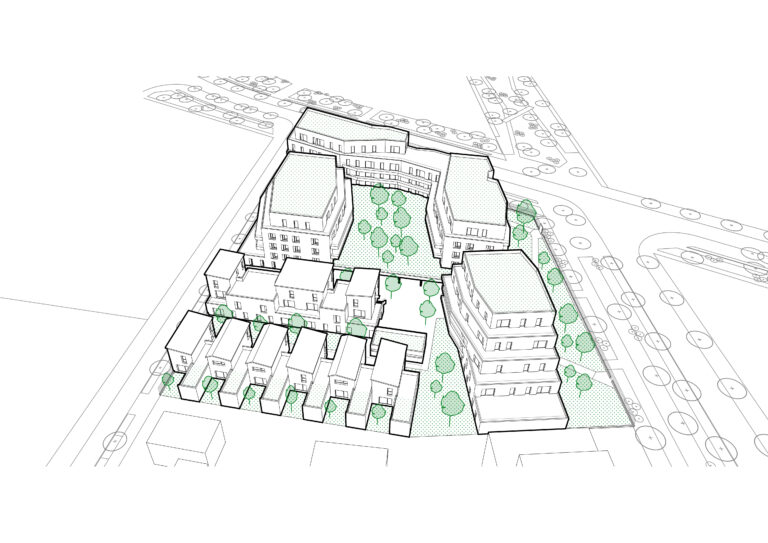 Le projet propose de faire « disparaître » les voitures du paysage. Le stationnement collectif est implanté à RDC dans le socle commun végétalisé des immeubles. Les places à l’usage des logements intermédiaires et individuels, extérieures, sont glissées sous l’ensemble intermédiaire.