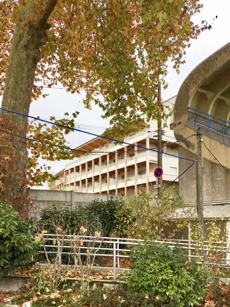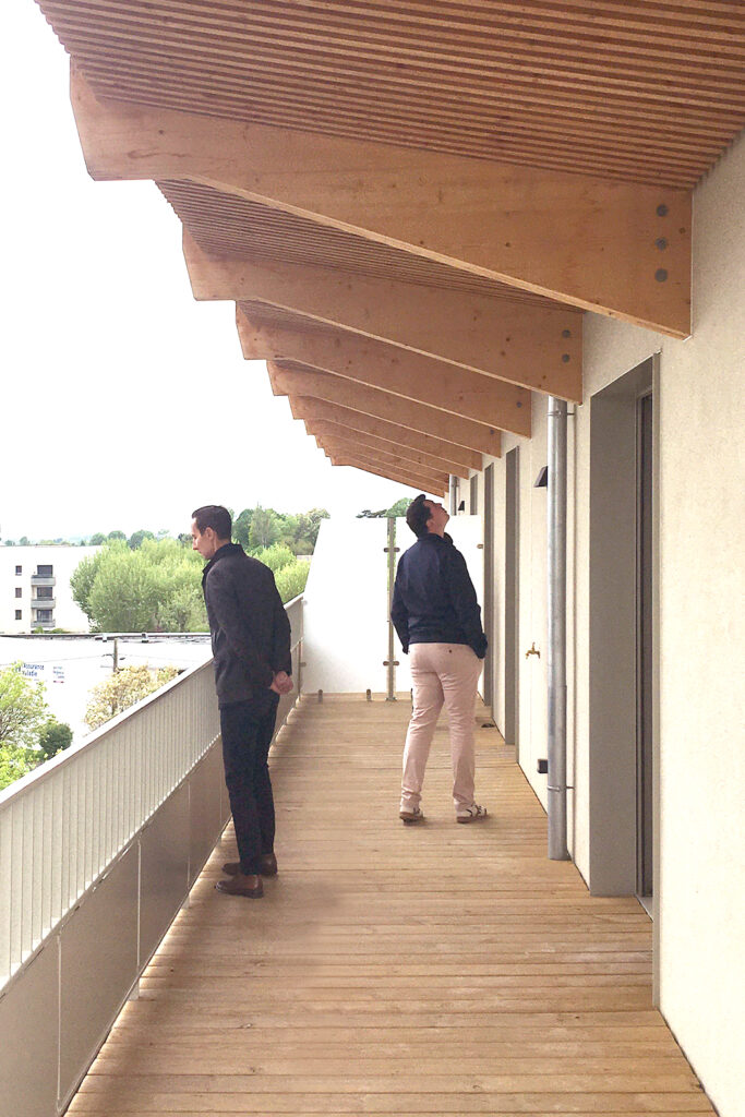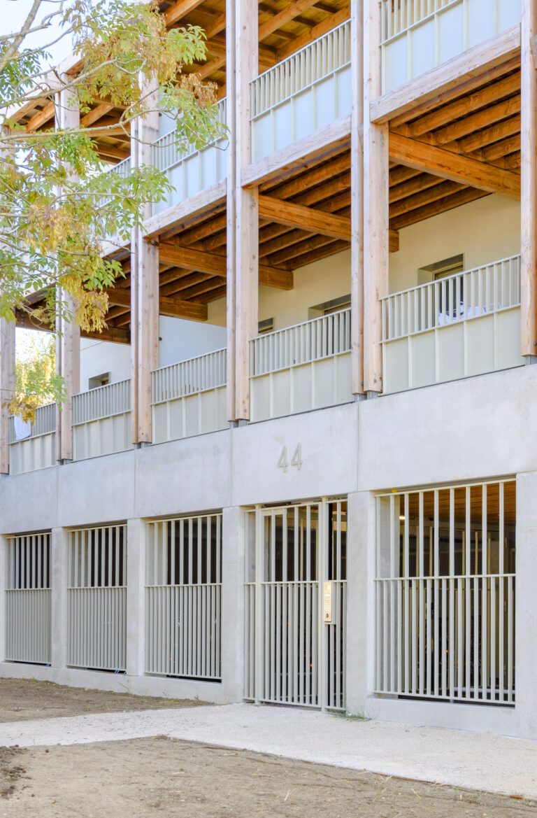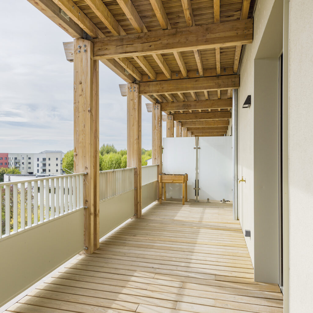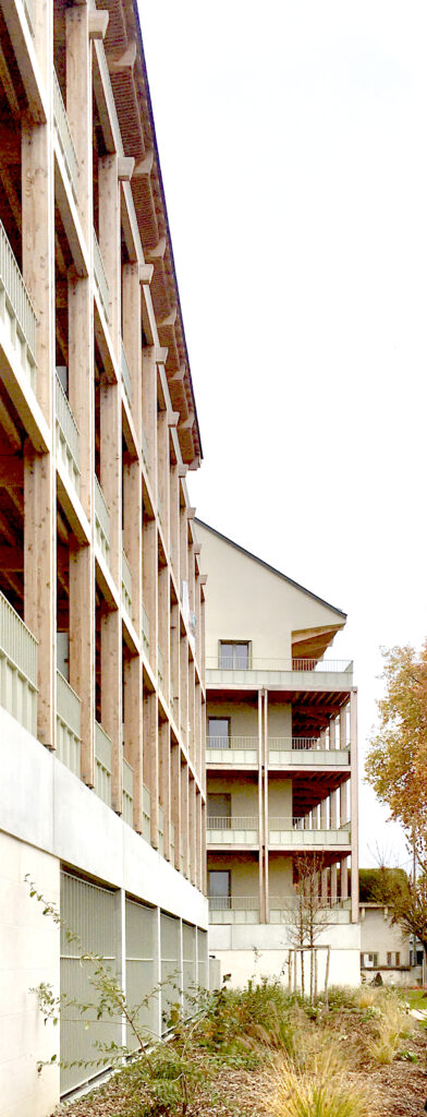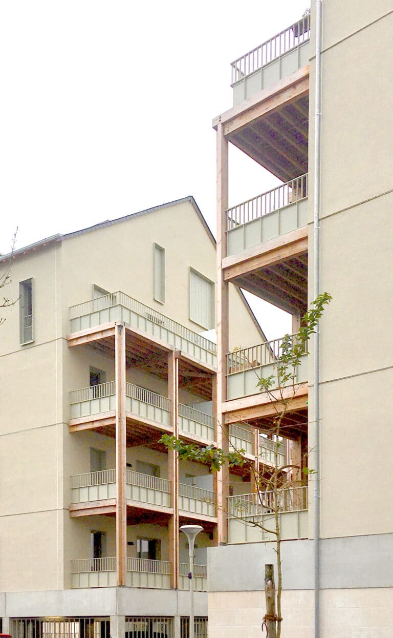 Les façades sont revêtues d’un enduit minéral blanc cassé. Seule l’armature en bois des balcons est visible. Elle dessine une grille formée par les lignes doubles des poteaux moisés croisant celles des balcons. Réalisée en pin Douglas purgé d’aubier qui lui confère une bonne durabilité, elle n’est pas traitée et laissée naturelle. De couleur rose-brun à l’origine, elle prendra au fil du temps une teinte grise argentée.
