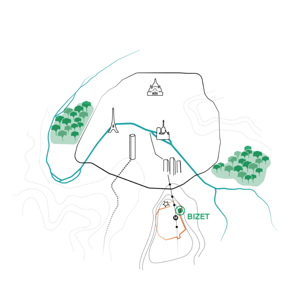 Le site est localisé au nord-Est de Villejuif, en limite de Vitry-sur-Seine, à moins de 2 km de Paris. Il se trouve dans un secteur résidentiel, où se côtoient petits immeubles collectifs et pavillons avec jardins. Il est constitué d’une série de parcelles en friche dans lesquelles une végétation spontanée s’est développée jusqu’à constituer un espace vert important qui, avec le grand terrain très arboré du réservoir d’eau non potable situé à proximité, constitue un réel poumon vert dans la ville. Le quartier est peu densément bâti, calme et à l’écart de toute nuisance. Le site est à flanc de coteau, et les rues Bizet et Emile Zola, en pente, offrent des vues lointaines sur le grand paysage du sud parisien qui participent de la qualité de vie de ce quartier.