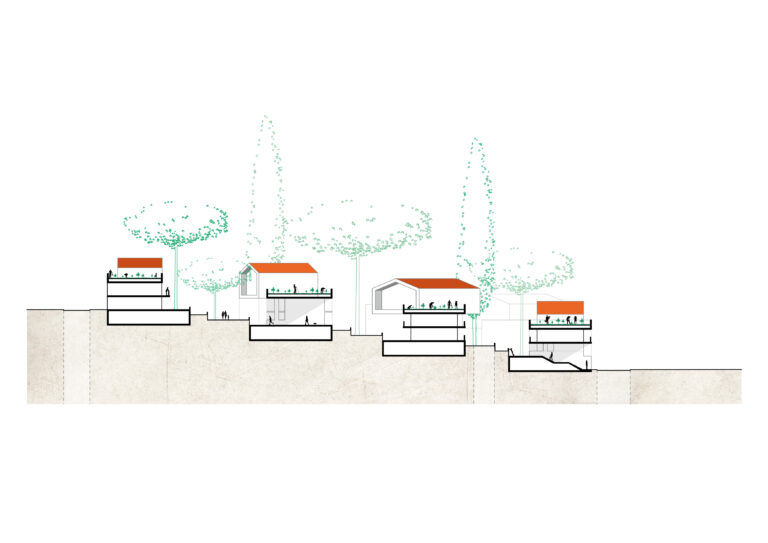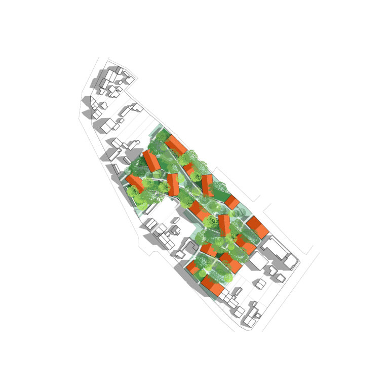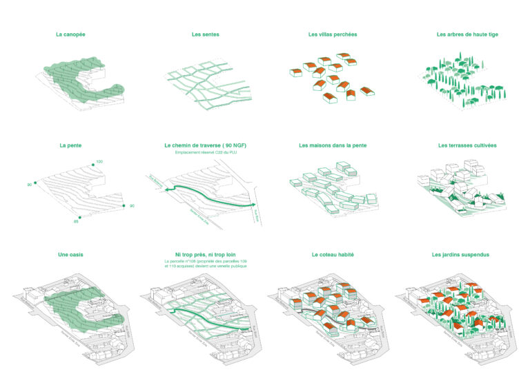 Le projet prévoit la construction de 250 logements, répartis dans des bâtiments décomposés en grosses villas de 2 niveaux posées sur un socle R+1 qui s’étagent dans la pente. Le stationnement, profitant de la topographie, est semi-enterré. L’objectif est de concilier densité urbaine et préservation du cadre bucolique du quartier. Assurer le respect du caractère pavillonnaire de ces quartiers (volumes, espaces verts, faible emprise au sol, biodiversité, etc.). Maintenir les cœurs d’îlots verts et la perception des jardins privés depuis l’espace public et rechercher leur ouverture visuelle par la création de nouvelles sentes. Proposer des typologies bâties collectives empruntant au registre de la maison individuelle (hauteur réduite des constructions, petites unités d’habitation, logement sur deux niveaux, taille généreuse des espaces extérieurs, accès individualisé au logement).