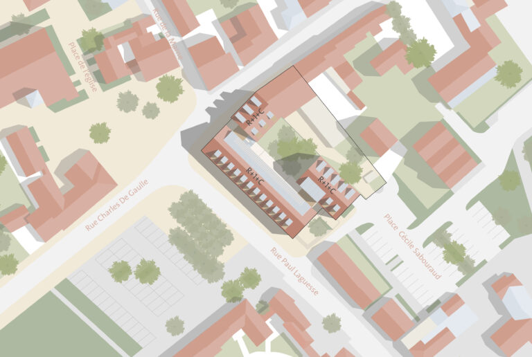 Le parti d’implantation repose sur une composition en trois bâtiments articulés autour d’une venelle intérieure, prolongeant le tracé existant de la rue de la Marne. Cette venelle structure l’ensemble du projet, dessert les logements et anime le coeur d’îlot comme une véritable rue habitée. Deux pignons forts viennent dialoguer avec la place de l’église et la place Cécile Sabouraud, affirmant l’idée d’une « place des pignons », en continuité avec les figures urbaines historiques du bourg. Le projet reconstitue ainsi des fronts bâtis lisibles, marque les angles, et redonne de l’épaisseur aux trottoirs.