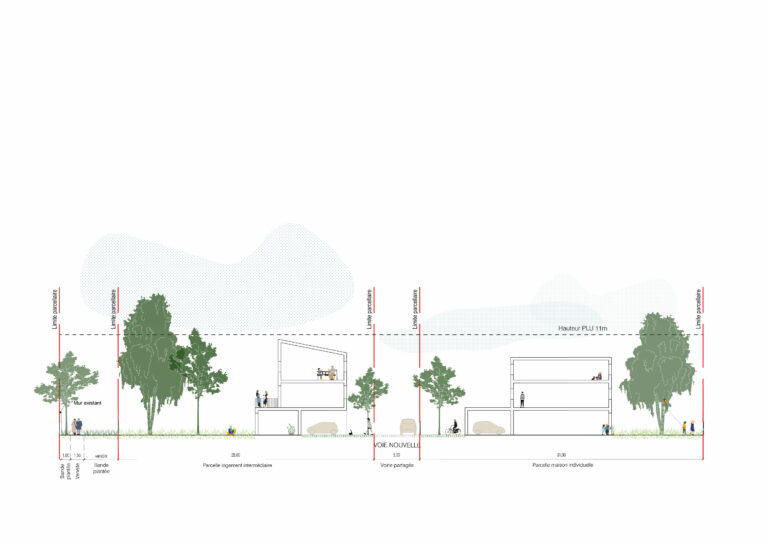 Le projet accorde une place centrale au paysage, avec la préservation du bois existant, l’aménagement d’un jardin de pluie pour la gestion des eaux pluviales, et la création de cheminements doux accessibles à tous. Le choix de matériaux simples, durables et peu nombreux participe à une démarche de frugalité, en cohérence avec une approche d’économie de projet et de valorisation du déjà-là.