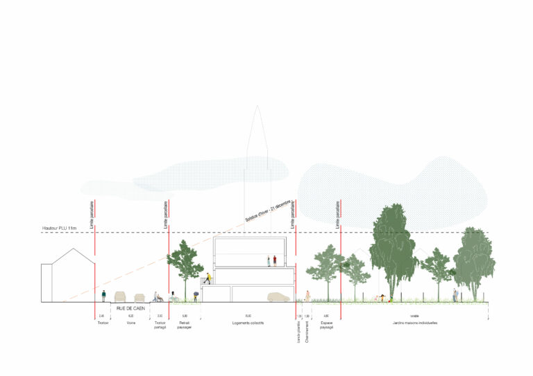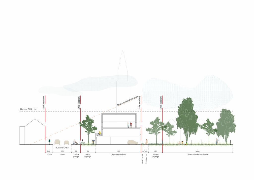 La mobilité privilégie les déplacements piétons et cyclables, tandis que la voiture est cantonnée à un rôle secondaire. Les stationnements sont majoritairement intégrés aux bâtiments ou regroupés en périphérie immédiate. La programmation associe commerces et services en rez-de-chaussée, logements collectifs en étage, et habitat intermédiaire ou individuel au cœur du quartier.