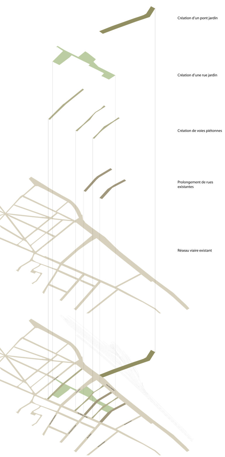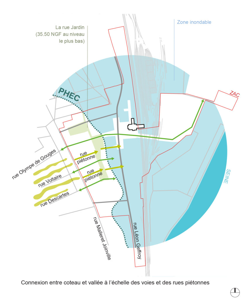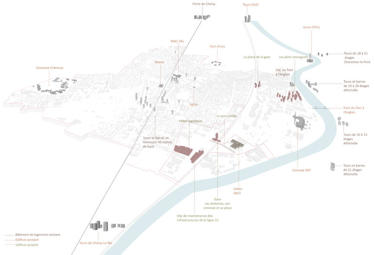 Le plan masse structure cette transformation à travers une programmation mixte et dense, la création d’un maillage d’espaces publics intégrant nature en ville et dispositifs de résilience face au risque d’inondation, ainsi que le maintien d’une forte activité économique. Les liaisons Est/Ouest permettent d’inscrire le quartier dans la continuité urbaine de Vitry-sur-Seine et de faire émerger un pôle multimodal constituant une nouvelle centralité urbaine et métropolitaine.