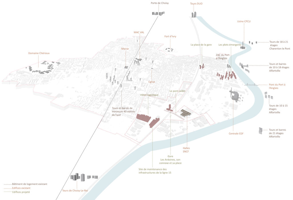 Le projet de la ZAC Gare Ardoines a pour objectif d’inventer une ville productive en transformant un vaste site industriel en un quartier urbain dense, mixte et attractif. Il associe activités économiques (productives et tertiaires), logements et fonctions récréatives autour d’espaces publics qualitatifs, tout en s’appuyant sur le renforcement des mobilités lié à l’arrivée du Grand Paris Express (ligne 15) et du TZen 5.