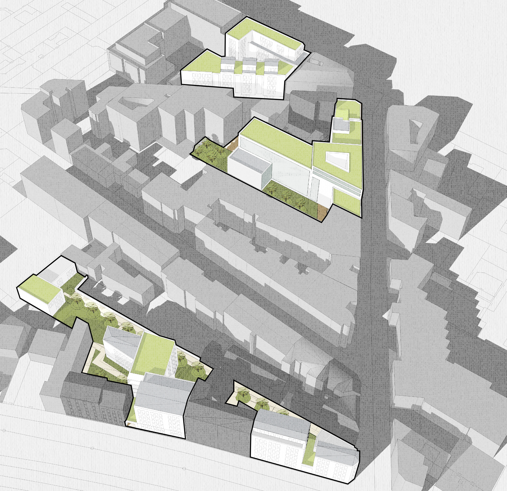 Le projet s’organise autour de trois secteurs complémentaires. Sur la première emprise, entre la rue de Lagny et la rue des Laitières, il est proposé de remplacer le bâti existant par deux nouveaux immeubles de logements, intégrant des commerces en rez-de-chaussée et s’ouvrant sur une cour commune végétalisée. À l’angle de la rue Victor Basch, une programmation mixte associe logements et bureaux, affirmant une présence urbaine plus structurée tout en ménageant des patios et des respirations intérieures. Enfin, sur le troisième secteur, le parti pris privilégie la réhabilitation des bâtiments existants et la construction de nouveaux logements organisés autour d’une venelle requalifiée, véritable colonne vertébrale paysagère du projet.